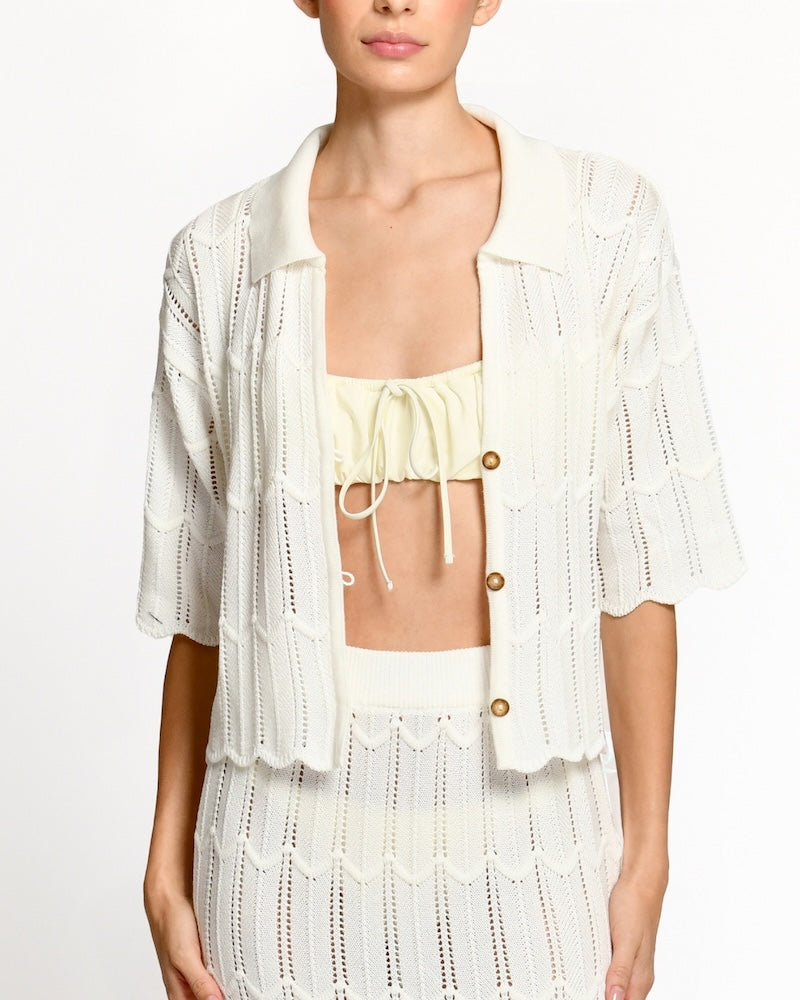 Crafted in a lightweight crochet-style knit, the Lau Blouse is breathable and soft against the skin. The front tie closures allow for adjustable coverage, while the short sleeves and fold-over collar give it a polished yet effortless finish. The ivory tone keeps it versatile and light, ideal for layering over swim or pairing with coordinating knit pieces.